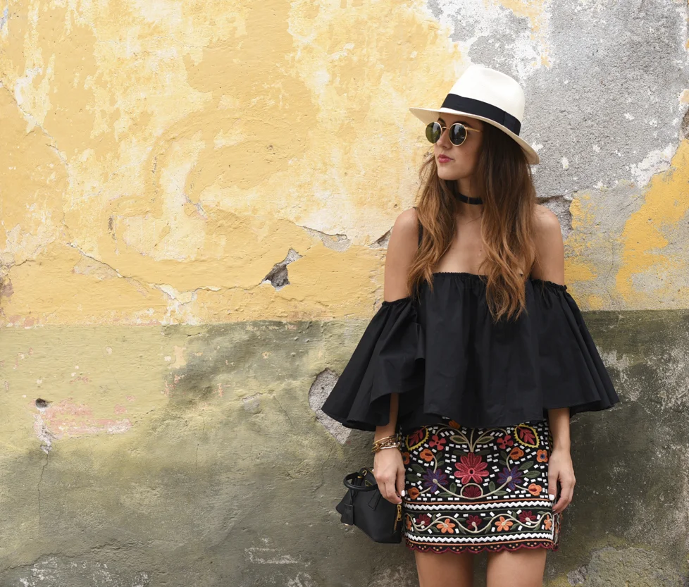 Bueno, sabrán que amo el negro, pero normalmente no uso negro en durante el día... y menos durante esta época de verano. Normalmente mis outfits negros son para eventos, o para tardes frías... hasta que encontré esta blusa sin mangas y sin hombros. No se si sepan, pero el clima en San Miguel por estas épocas es bastante loco... solazo y calorón, y a veces lluvias de 20 minutos... Dicho lo anterior, decidí usar esta blusa negra con una falda colorida de zara (que ya había sacado en el blog antes)... y mis botines cafés (de tres años de uso, jaja). El sombrero lo compré en una tienda de puros, y además de ponerle un toque diferente al outfit, ayudó a que no me tatemara la cara con el sol que salió durante varias horas...