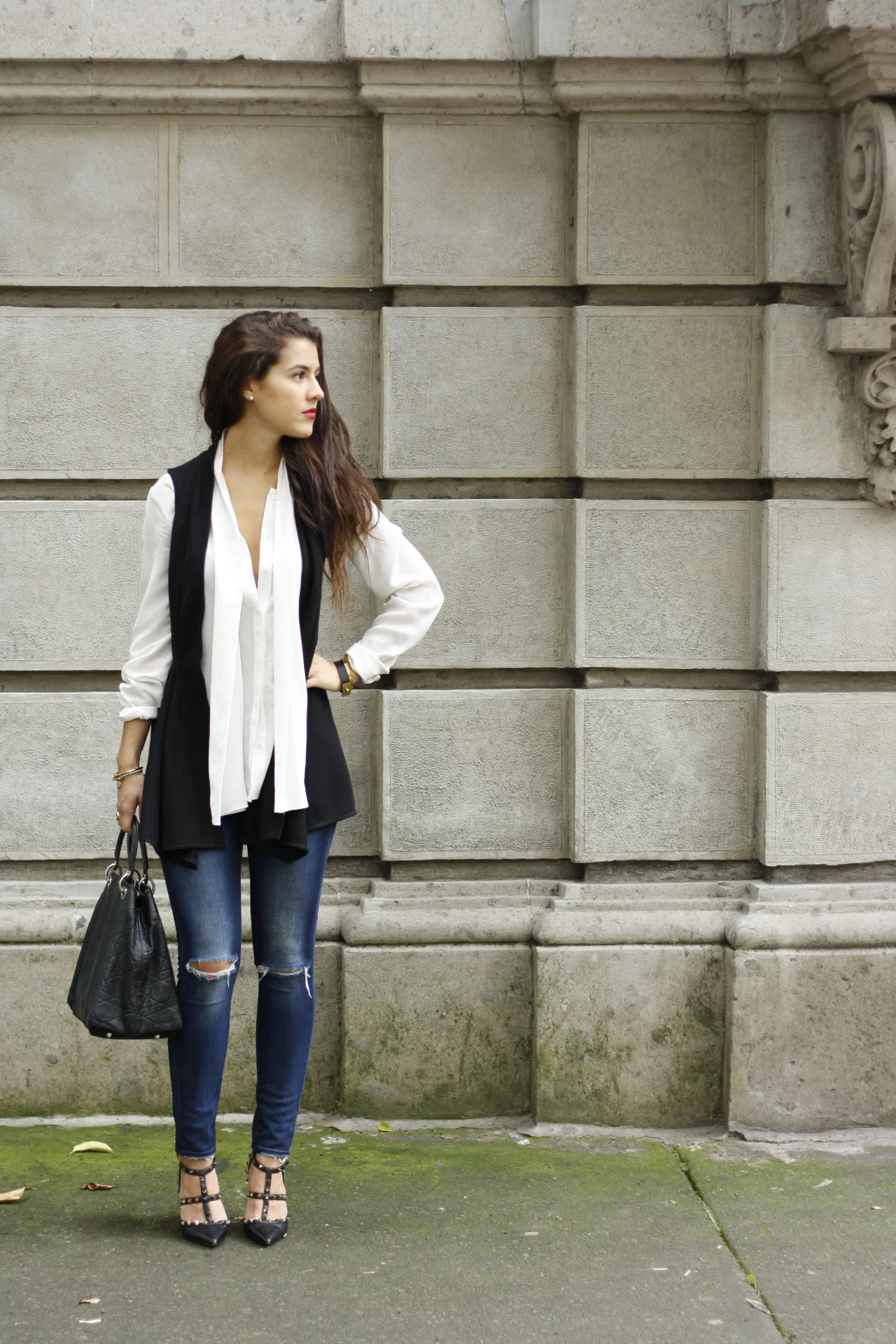 Vest: Allier-Atellier / Blouse: Uterque / Jeans: Madewell / Heels: Valentino / Bag: Dior