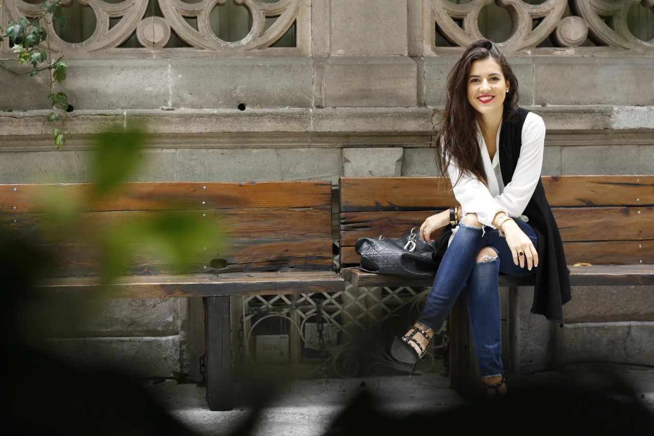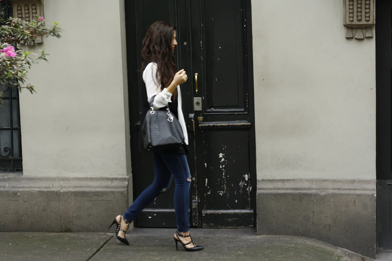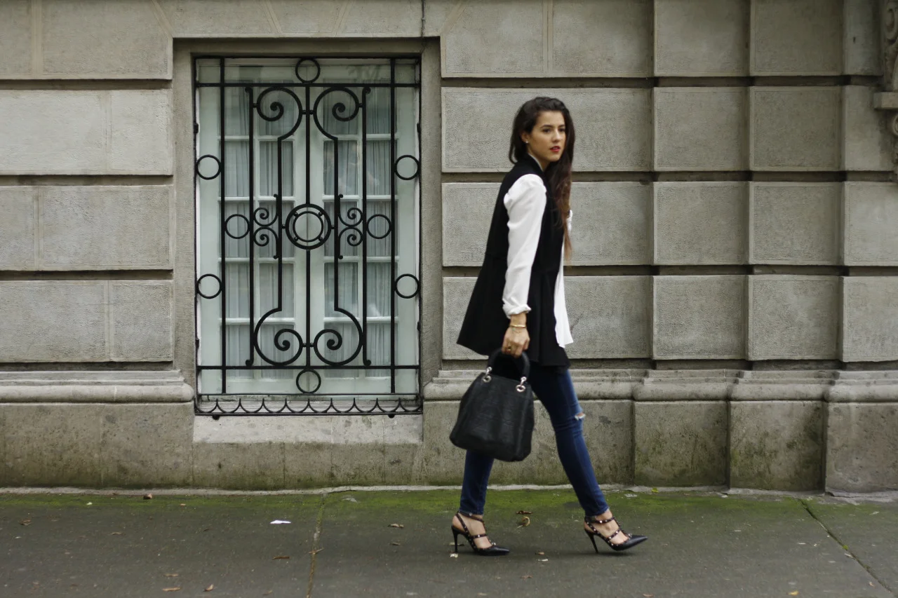 Chaleco: Allier-Atellier / Blusa: Uterque / Jeans: Madewell / Tacones: Valentino / Bolsa: Dior